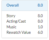 76명의 평가 중 8.3점으로 좋은 평가를 기록하며 mydramaList와 비슷한 평점을 기록하고 있습니다.