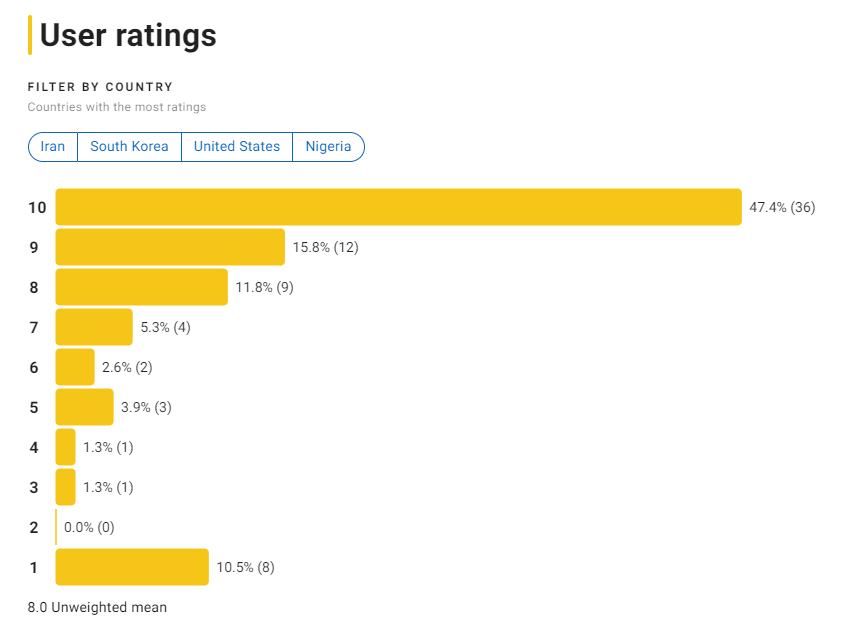 76명의 평가 중 8.3점으로 좋은 평가를 기록하며 mydramaList와 비슷한 평점을 기록하고 있습니다.