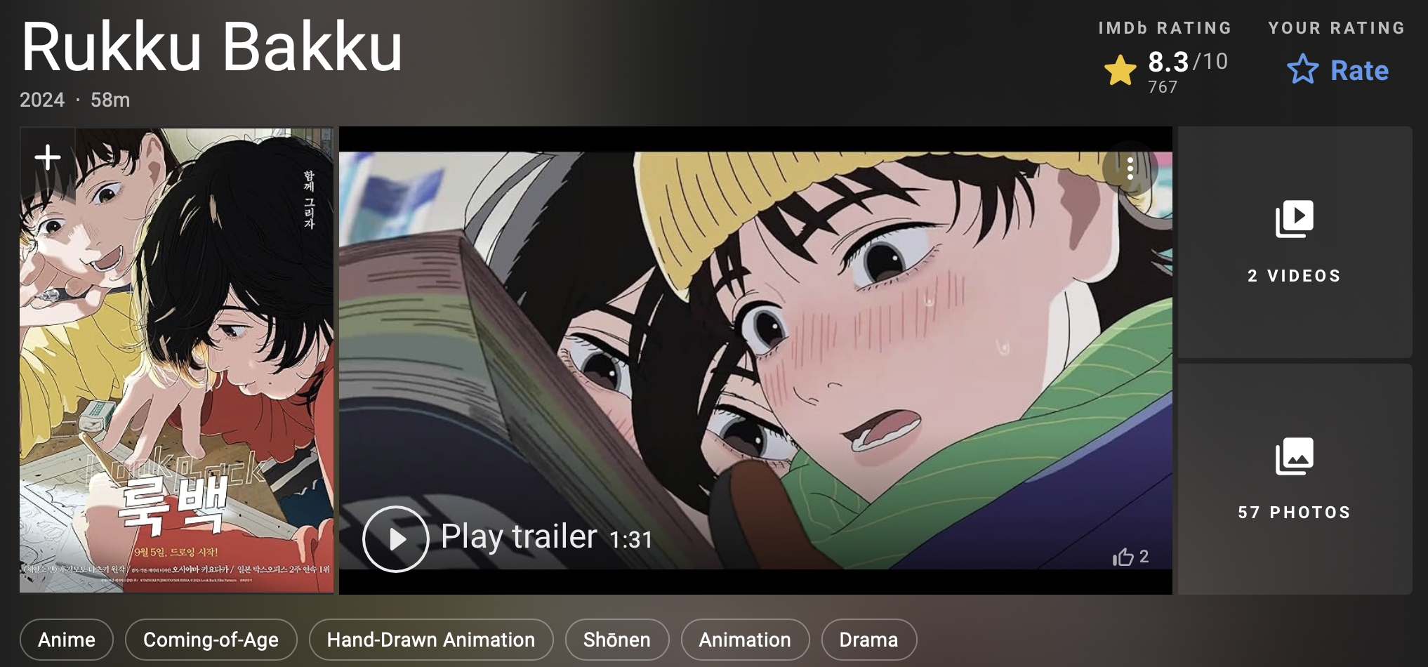 일본 애니메이션 영화 룩백 ( 영어제목 : Look Back ) 의 IMDB 평점입니다.
